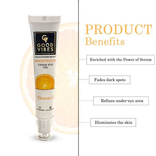Descsripition:Brimming with the power of serum, Good Vibes Vitamin C Brightening Under Eye Gel is just the treatment you need to fade away pesky dark circles. Power-packed with antioxidants, it helps reduce the appearance of dark spots and pigmentation leaving you with flawless radiance. Just roll-on and glow on with Good Vibes!